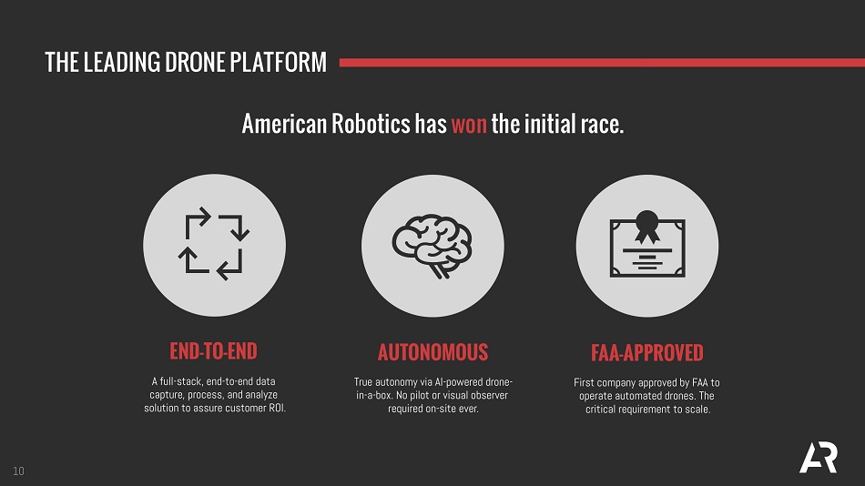THE LEADING DRONE PLATFORM END - TO - END A full - stack, end - to - end data capture, process, and analyze solution to assure customer ROI. AUTONOMOUS True autonomy via AI - powered drone - in - a - box. No pilot or visual observer required on - site ever. FAA - APPROVED First company approved by FAA to operate automated drones. The critical requirement to scale. American Robotics has won the initial race. 10