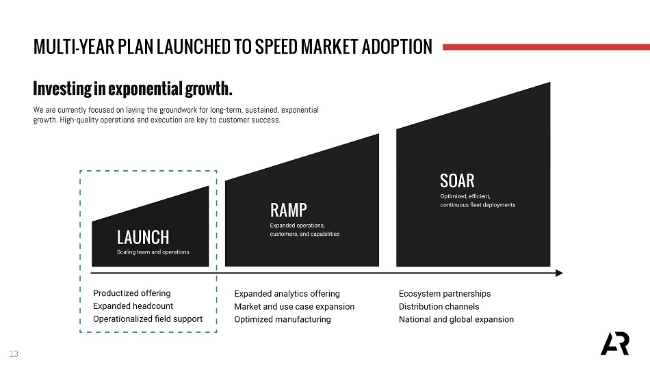 Investing in exponential growth. We are currently focused on laying the groundwork for long - term, sustained, exponential growth. High - quality operations and execution are key to customer success. RAMP Expanded operations, customers, and capabilities LAUNCH Scaling team and operations SOAR Optimized, eficient, continuous fleet deployments Productized offering Expanded headcount Operationalized field support MULTI - YEAR PLAN LAUNCHED TO SPEED MARKET ADOPTION Expanded analytics offering Market and use case expansion Optimized manufacturing Ecosystem partnerships Distribution channels National and global expansion 13