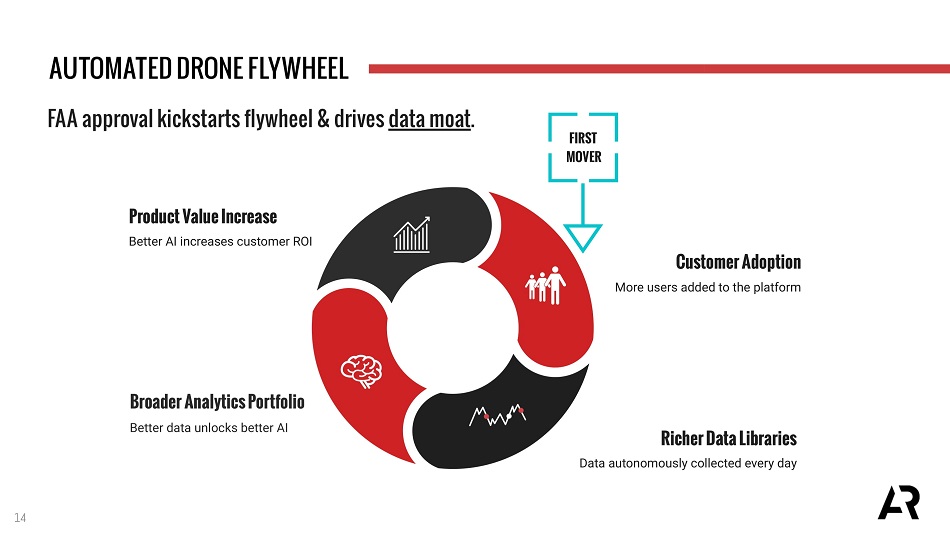 FAA approval kickstarts flywheel & drives d ata moat . Customer Adoption More users added to the platform Richer Data Libraries Data autonomously collected every day Broader Analytics Portfolio Better data unlocks better AI Product Value Increase Better AI increases customer ROI AUTOMATED DRONE FLYWHEEL FIRST MO VER 1 4