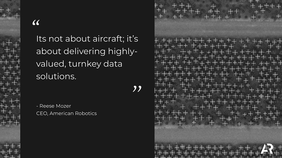 - Reese Mozer CEO, American Robotics Its not about aircraft; it’s about delivering highly - valued, turnkey data solutions. " '' 15