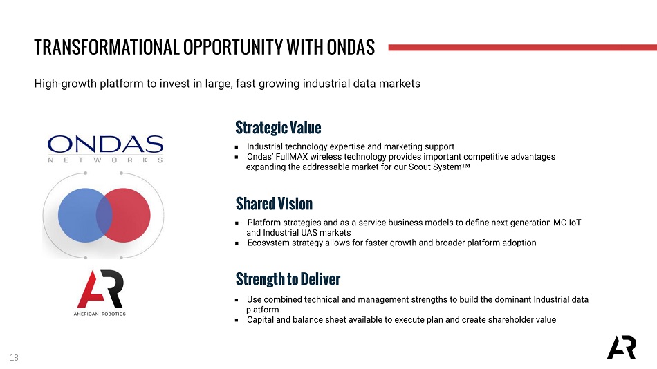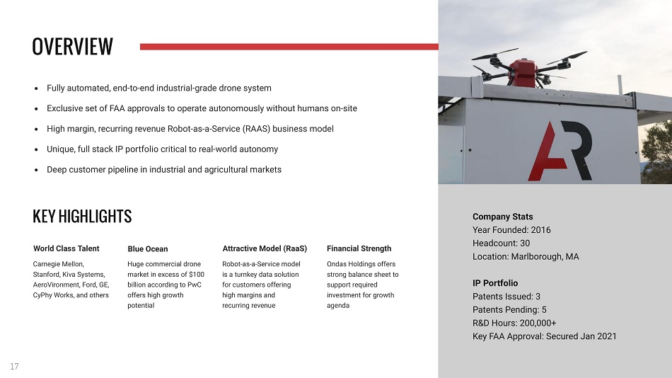 Company Stats Year Founded: 2016 Headcount: 30 Location: Marlborough, MA IP Portfolio Patents Issued: 3 Patents Pending: 5 R&D Hours: 200,000+ Key FAA Approval: Secured Jan 2021 OVERVIEW Fully automated, end - to - end industrial - grade drone system Exclusive set of FAA approvals to operate autonomously without humans on - site High margin, recurring revenue Robot - as - a - Service (RAAS) business model Unique, full stack IP portfolio critical to real - world autonomy Deep customer pipeline in industrial and agricultural markets KEY HIGHLIGHTS World Class Talent Carnegie Mellon, Stanford, Kiva Systems, AeroVironment, Ford, GE, CyPhy Works, and others 17 Blue Ocean Huge commercial drone market in excess of $100 billion according to PwC offers high growth potential Attractive Model (RaaS) Robot - as - a - Service model is a turnkey data solution for customers offering high margins and recurring revenue Financial Strength Ondas Holdings offers strong balance sheet to support required investment for growth agenda