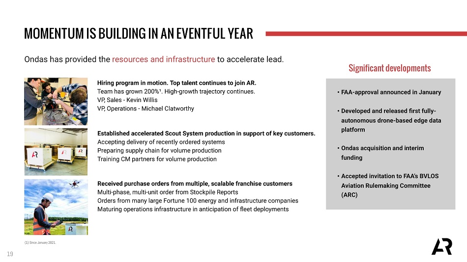 MOMENTUM IS BUILDING IN AN EVENTFUL YEAR Hiring program in motion . Top talent continues to join AR . Team has grown 200 % ¹ . High - growth trajectory continues . VP, Sales - Kevin Willis VP, Operations - Michael Clatworthy Ondas has provided the resources and infrastructure to accelerate lead. Established accelerated Scout System production in support of key customers. Accepting delivery of recently ordered systems Preparing supply chain for volume production Training CM partners for volume production 1 9 Received purchase orders from multiple, scalable franchise customers Multi - phase, multi - unit order from Stockpile Reports Orders from many large Fortune 100 energy and infrastructure companies Maturing operations infrastructure in anticipation of fleet deployments • FAA - approval announced in January • Developed and released first fully - autonomous drone - based edge data platform • Ondas acquisition and interim funding • Accepted invitation to FAA's BVLOS Aviation Rulemaking Committee (ARC) Significant developments (1) Since January 2021.