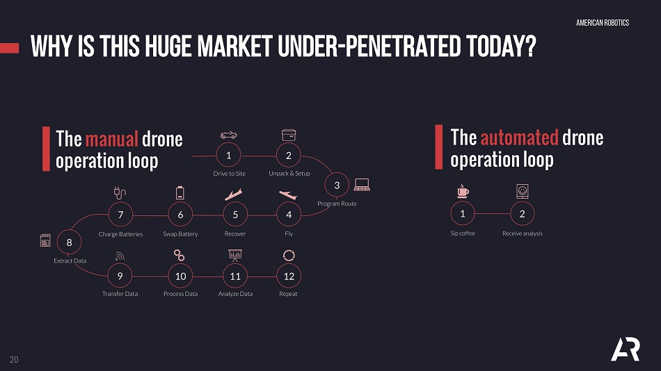 why is this huge market under - penetrated today? The manual drone operation loop 1 7 Drive to Site 2 Unpack & Setup 3 Program Route 4 F l y 5 R e c o v e r 6 Swap Battery Charge Batteries 8 Extract Data 9 Transfer Data 10 Process Data 11 Analyze Data 12 R e p e a t 1 Sip coffee 2 Receive analysis The automated drone operation loop AMERICAN ROBOTICS 20