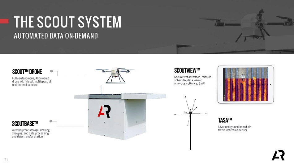 ScoutView Secure web interface, mission scheduler, data viewer, analytics software, & API Scout Drone Fully - autonomous, AI - powered drone with visual, multispectral, and thermal sensors ScoutBase Weatherproof storage, docking, charging, and data processing, and data transfer station THE SCOUT SYSTEM AUTOMATED DATA ON - DEMAND TASA Advanced ground - based air traffic detection sensor 21