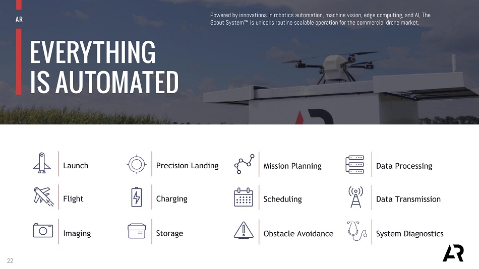 EVERYTHING IS AUTOMATED Launch 22 A R Flight Imaging Precision Landing Charging Storage Mission Planning Scheduling Obstacle Avoidance Data Processing Data Transmission System Diagnostics Powered by innovations in robotics automation, machine vision, edge computing, and AI, The Scout System is unlocks routine scalable operation for the commercial drone market.