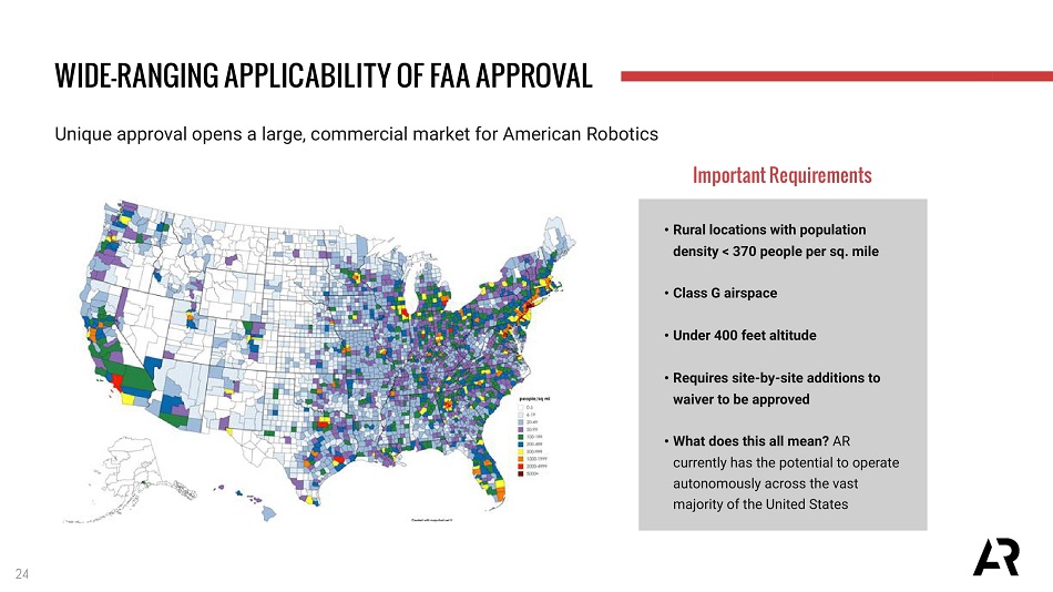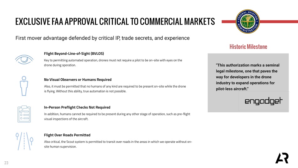 EXCLUSIVE FAA APPROVAL CRITICAL TO COMMERCIAL MARKETS First mover advantage defended by critical IP, trade secrets, and experience Flight Beyond - Line - of - Sight (BVLOS) Key to permitting automated operation, drones must not require a pilot to be on - site with eyes on the drone during operation. No Visual Observers or Humans Required Also, it must be permitted that no humans of any kind are required to be present on - site while the drone is flying. Without this ability, true automation is not possible. In - Person Preflight Checks Not Required In addition, humans cannot be required to be present during any other stage of operation, such as pre - flight visual inspections of the aircraft. Flight Over Roads Permitted Also critical, the Scout system is permitted to transit over roads in the areas in which we operate without on - site human supervision. "This authorization marks a seminal legal milestone, one that paves the way for developers in the drone industry to expand operations for pilot - less aircraft.” Historic Milestone 23