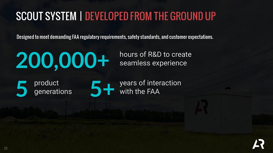 SCOUT SYSTEM | DEVELOPED FROM THE GROUND UP Designed to meet demanding FAA regulatory requirements, safety standards, and customer expectations. 200 , 000+ Lorem ipsum dolor sit amet. product gene r ations 5 5+ hours of R&D to create seamless experience Lorem ipsum dolor sit amet. years of interaction with the FAA 25