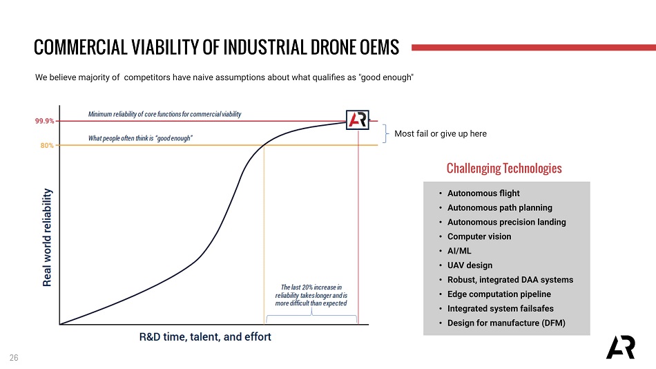 COMMERCIAL VIABILITY OF INDUSTRIAL DRONE OEMS • Autonomous flight • Autonomous path planning • Autonomous precision landing • Computer vision • AI/ML • UAV design • Robust, integrated DAA systems • Edge computation pipeline • Integrated system failsafes • Design for manufacture (DFM) 26 Most fail or give up here Challenging Technologies We believe majority of competitors have naive assumptions about what qualifies as "good enough"