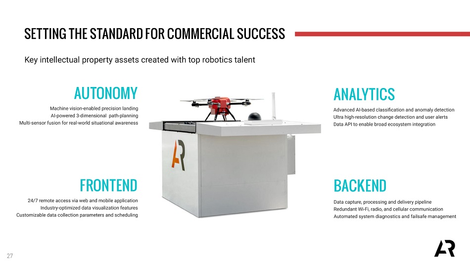 SETTING THE STANDARD FOR COMMERCIAL SUCCESS ANALYTICS Advanced AI - based classification and anomaly detection Ultra high - resolution change detection and user alerts Data API to enable broad ecosystem integration 27 BACKEND Data capture, processing and delivery pipeline Redundant Wi - Fi, radio, and cellular communication Automated system diagnostics and failsafe management FRONTEND 24/7 remote access via web and mobile application Industry - optimized data visualization features Customizable data collection parameters and scheduling AUTONOMY Machine vision - enabled precision landing AI - powered 3 - dimensional path - planning Multi - sensor fusion for real - world situational awareness Key intellectual property assets created with top robotics talent