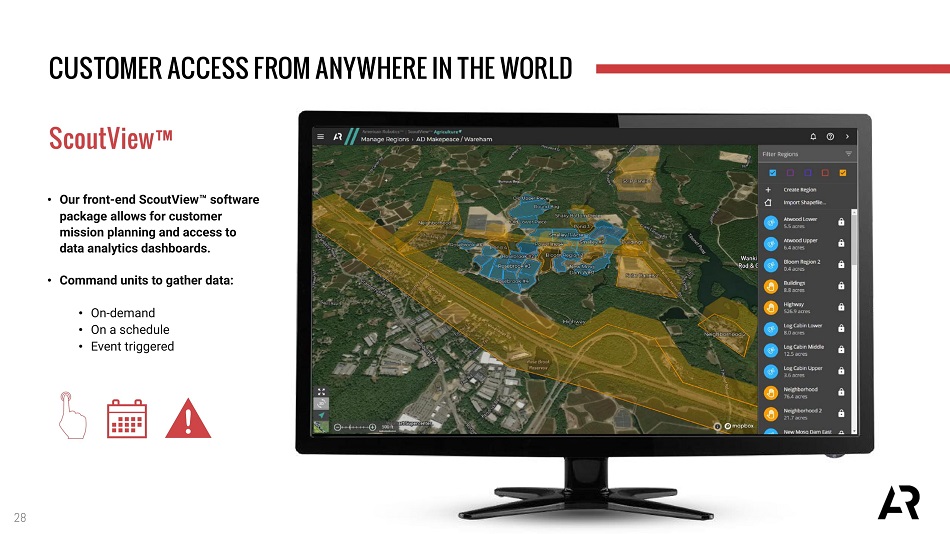 CUSTOMER ACCESS FROM ANYWHERE IN THE WORLD • Our front - end ScoutView Ʀ software package allows for customer mission planning and access to data analytics dashboards. • Command units to gather data: • On - demand • On a schedule • Event triggered ScoutVi e w 28