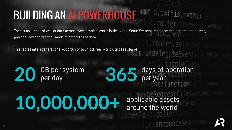 BUILDING AN AI POWERHOUSE There's an untapped well of data across every physical asset in the world. Scout Systems represent the potential to collect, process, and analyze thousands of petabytes of data. This represents a generational opportunity to unlock real - world use cases for AI. GB per system per day 20 365 days of operation per year Lorem ipsum dolor sit amet. 10,000,000+ applicable assets around the world 31