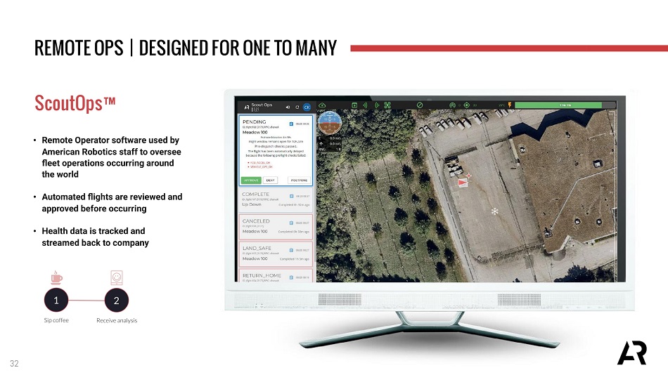 REMOTE OPS | DESIGNED FOR ONE TO MANY ScoutOps • Remote Operator software used by American Robotics staff to oversee fleet operations occurring around the world • Automated flights are reviewed and approved before occurring • Health data is tracked and streamed back to company 1 32 Sip coffee 2 Receive analysis