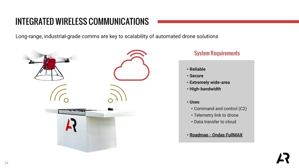 INTEGRATED WIRELESS COMMUNICATIONS Long - range, industrial - grade comms are key to scalability of automated drone solutions System Requirements • Reliable • Secure • Extremely wide - area • High - bandwidth • Uses • Command and control (C2) • Telemetry link to drone • Data transfer to cloud • Roadma p - Ondas FullMAX 34