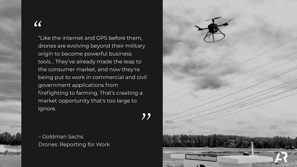 – Goldman Sachs Drones: Reporting for Work “Like the internet and GPS before them, drones are evolving beyond their military origin to become powerful business tools… They’ve already made the leap to the consumer market, and now they're being put to work in commercial and civil government applications from firefighting to farming. That’s creating a market opportunity that's too large to ignore. " '' 36