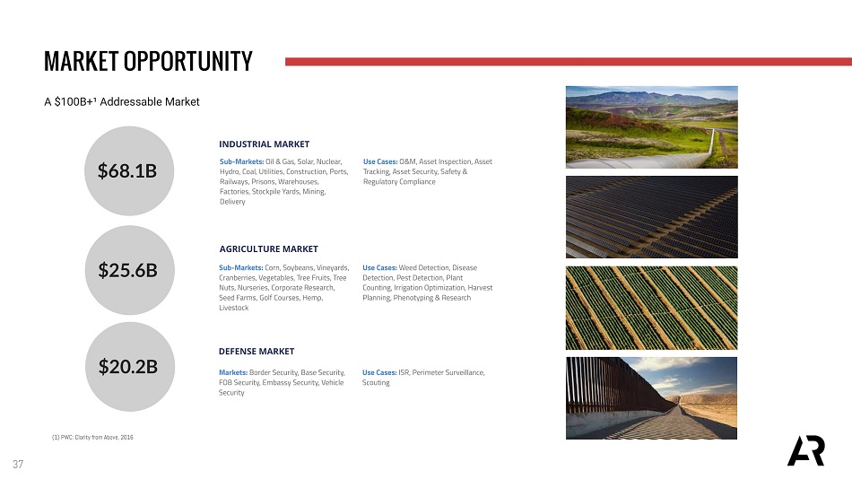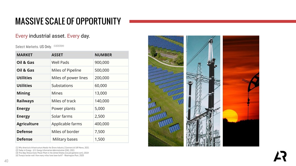 MASSIVE SCALE OF OPPORTUNITY Every industrial asset. Every day. Select Markets. US Only . (1)(2)(3)(4) MARKET ASSET NUMBER Oil & Gas Well Pads 900,000 Oil & Gas Miles of Pipeline 500,000 Utilities Miles of power lines 200,000 Utilities Substations 60,000 Mining Mines 13,000 Railways Miles of track 140,000 Energy Power plants 5,000 Energy Solar farms 2,500 Agriculture Applicable farms 400,000 Defense Miles of border 7,500 Defense Military bases 1,500 (1) Why America’s Infrastructure Needs the Drone Industry | Commercial UAV News, 2021 (2) Today in Energy - U.S. Energy Information Administration (EIA), 2021 (3) This Map Shows Every Power Plant in the United States (visualcapitalist.com), 2019 (4) Trump’s border wall: How many miles have been built? - Washington Post, 2020 40