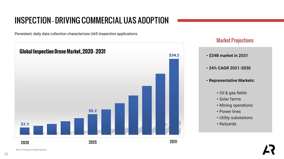 MARKET OPPORTUNITY AGRICULTURE MARKET INDUSTRIAL MARKET DEFENSE MARKET Use Cases: O&M, Asset Inspection, Asset Tracking, Asset Security, Safety & Regulatory Compliance Markets : Border Security, Base Security, FOB Security, Embassy Security, Vehicle Security Use Cases: ISR, Perimeter Surveillance, Scouting Sub - Markets: Corn, Soybeans, Vineyards, Cranberries, Vegetables, Tree Fruits, Tree Nuts, Nurseries, Corporate Research, Seed Farms, Golf Courses, Hemp, Livestock Use Cases: Weed Detection, Disease Detection, Pest Detection, Plant Counting, Irrigation Optimization, Harvest Planning, Phenotyping & Research Sub - Markets: Oil & Gas, Solar, Nuclear, Hydro, Coal, Utilities, Construction, Ports, Railways, Prisons, Warehouses, Factories, Stockpile Yards, Mining, Delivery A $100B+¹ Addressable Market (1) PWC: Clarity from Above, 2016 $68 . 1 B $25 . 6 B $20 . 2 B 37