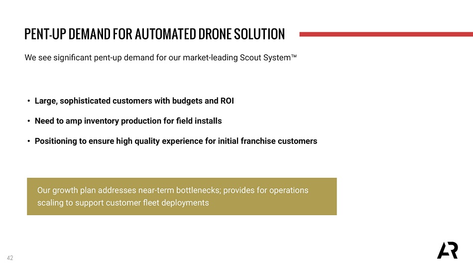 PENT - UP DEMAND FOR AUTOMATED DRONE SOLUTION We see significant pent - up demand for our market - leading Scout System • Large, sophisticated customers with budgets and ROI • Need to amp inventory production for field installs • Positioning to ensure high quality experience for initial franchise customers 42 Our growth plan addresses near - term bottlenecks; provides for operations scaling to support customer fleet deployments