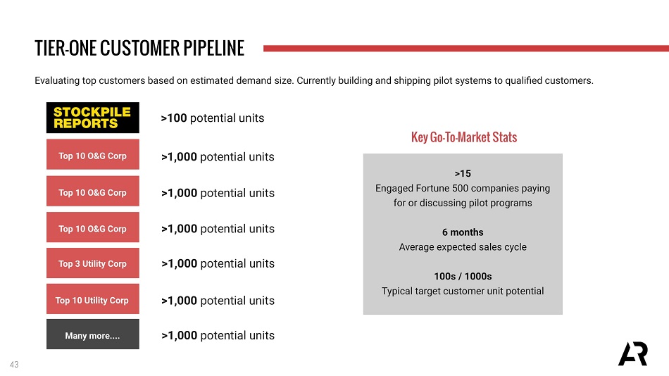 TIER - ONE CUSTOMER PIPELINE Evaluating top customers based on estimated demand size. Currently building and shipping pilot systems to qualified customers. >100 potential units 43 Top 10 O&G Corp Top 10 O&G Corp Top 10 O&G Corp Top 3 Utility Corp Top 10 Utility Corp Many more.... >1,000 potential units >1,000 potential units >1,000 potential units >1,000 potential units >1,000 potential units >1,000 potential units >15 Engaged Fortune 500 companies paying for or discussing pilot programs 6 months Average expected sales cycle 100s / 1000s Typical target customer unit potential Key Go - To - Market Stats