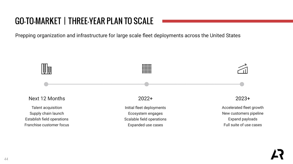 GO - TO - MARKET | THREE - YEAR PLAN TO SCALE Prepping organization and infrastructure for large scale fleet deployments across the United States Next 12 Months Talent acquisition Supply chain launch Establish field operations Franchise customer focus 44 2022+ Initial fleet deployments Ecosystem engages Scalable field operations Expanded use cases 2023+ Accelerated fleet growth New customers pipeline Expand payloads Full suite of use cases
