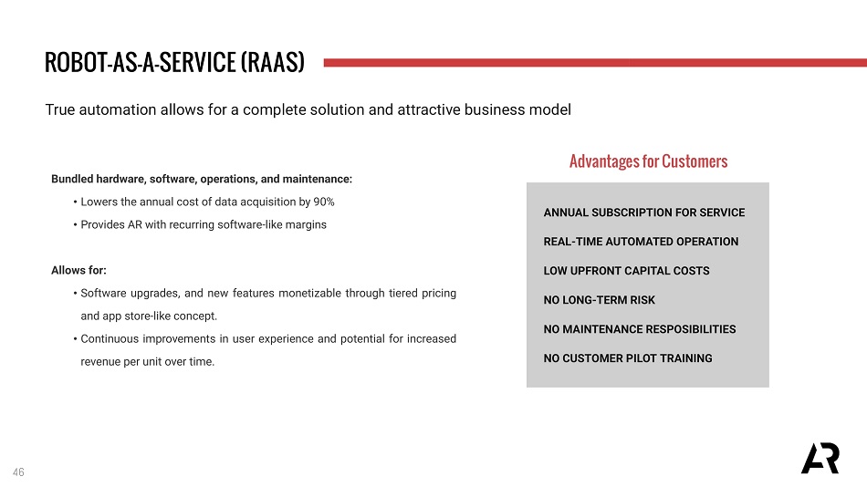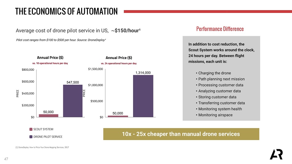 ROBOT - AS - A - SERVICE (RAAS) Bundled hardware, software, operations, and maintenance: • Lowers the annual cost of data acquisition by 90% • Provides AR with recurring software - like margins 46 True automation allows for a complete solution and attractive business model Advantages for Customers Allows for: • Software upgrades, and new features monetizable through tiered pricing and app store - like concept. • Continuous improvements in user experience and potential for increased revenue per unit over time. ANNUAL SUBSCRIPTION FOR SERVICE REAL - TIME AUTOMATED OPERATION LOW UPFRONT CAPITAL COSTS NO LONG - TERM RISK NO MAINTENANCE RESPOSIBILITIES NO CUSTOMER PILOT TRAINING