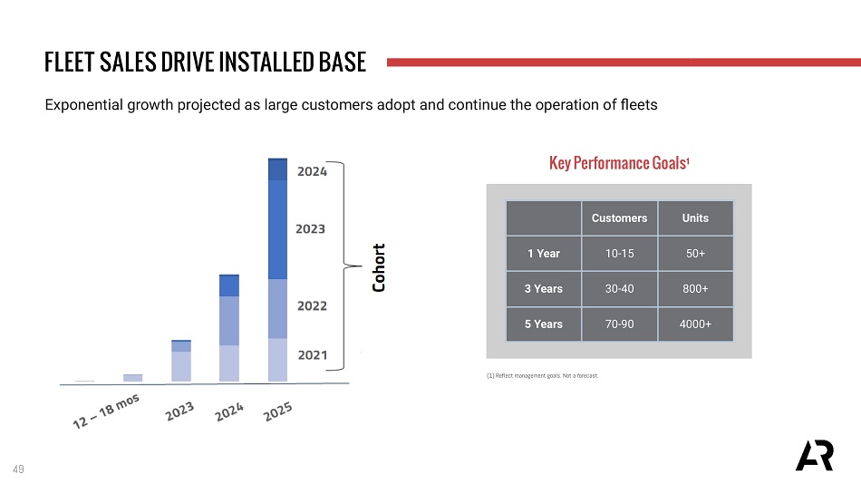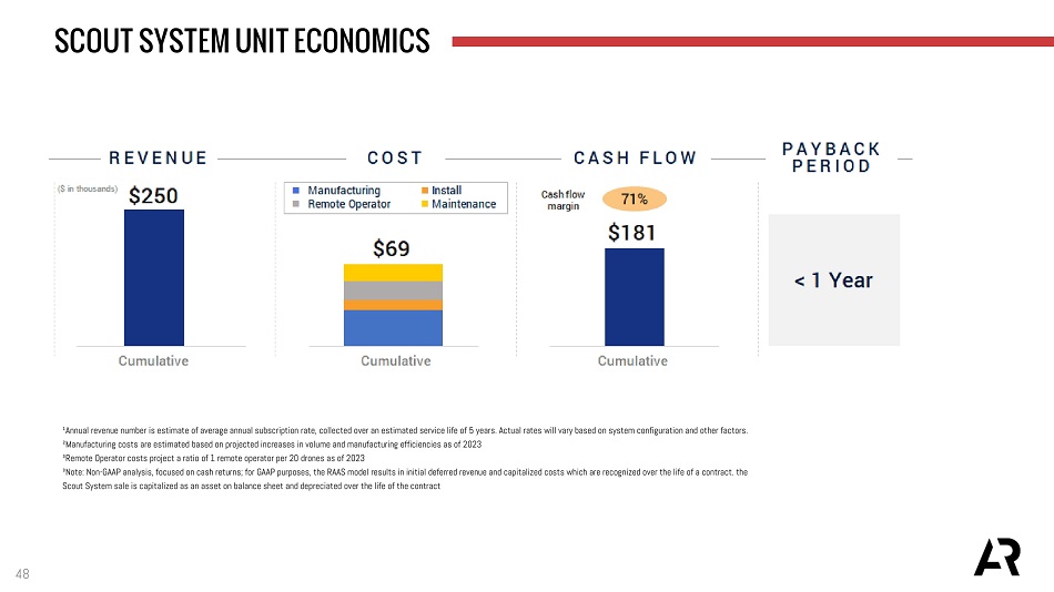¹Annual revenue number is estimate of average annual subscription rate, collected over an estimated service life of 5 years. Actual rates will vary based on system configuration and other factors. ²Manufacturing costs are estimated based on projected increases in volume and manufacturing efficiencies as of 2023 ³Remote Operator costs project a ratio of 1 remote operator per 20 drones as of 2023 ³Note: Non - GAAP analysis, focused on cash returns; for GAAP purposes, the RAAS model results in initial deferred revenue and capitalized costs which are recognized over the life of a contract. the Scout System sale is capitalized as an asset on balance sheet and depreciated over the life of the contract SCOUT SYSTEM UNIT ECONOMICS 48