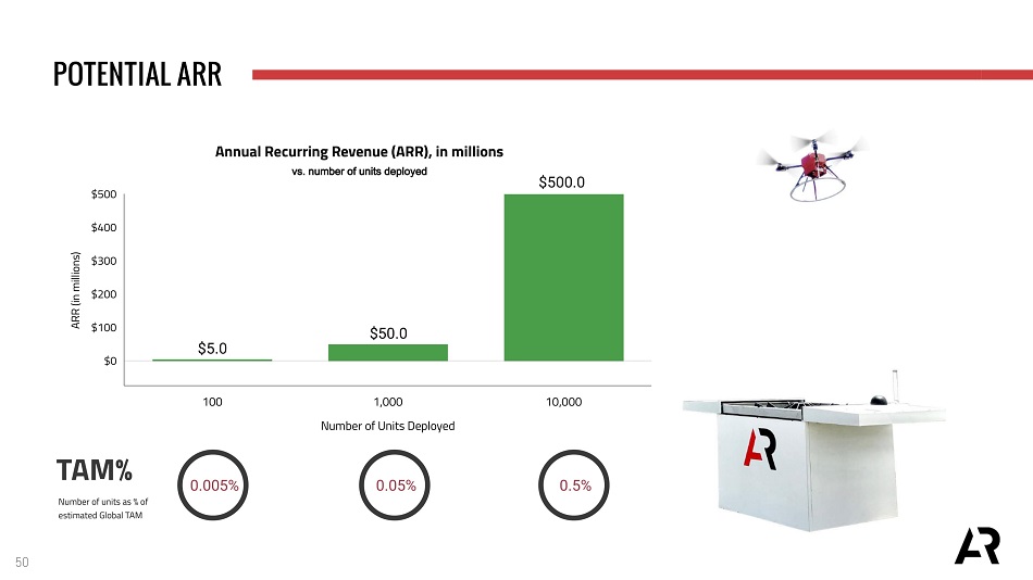 Annual Recurring Revenue (ARR), in millions vs. number of units deployed ARR (in millions) $50 0 $40 0 $30 0 $20 0 $10 0 $ 0 10 0 1,000 Number of Units Deployed 10 , 00 0 TAM% Number of units as % of estimated Global TAM 0.005% 0.05% 0.5% $5.0 $50.0 $500.0 POTENTIAL ARR 50