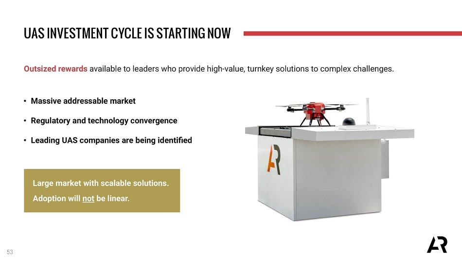 UAS INVESTMENT CYCLE IS STARTING NOW Outsized rewards available to leaders who provide high - value, turnkey solutions to complex challenges. • Massive addressable market • Regulatory and technology convergence • Leading UAS companies are being identified Large market with scalable solutions. Adoption will not be linear. 53