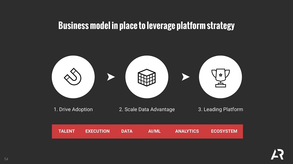 Business model in place to leverage platform strategy 1. Drive Adoption 2. Scale Data Advantage 3. Leading Platform TALENT EXECUTION DATA AI/ML ANALYTICS ECOSYSTEM 54