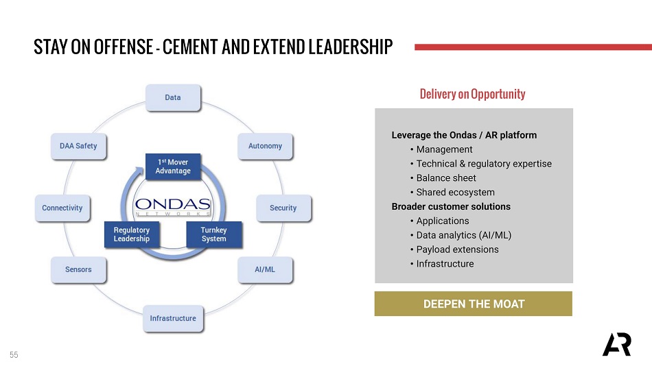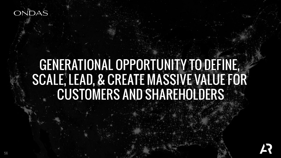 STAY ON OFFENSE - CEMENT AND EXTEND LEADERSHIP Leverage the Ondas / AR platform • Management • Technical & regulatory expertise • Balance sheet • Shared ecosystem Broader customer solutions • Applications • Data analytics (AI/ML) • Payload extensions • Infrastructure 55 Delivery on Opportunity DEEPEN THE MOAT