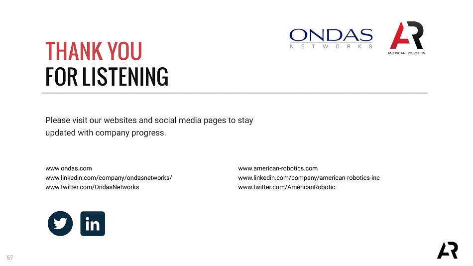 Please visit our websites and social media pages to stay updated with company progress. THANK YOU FOR LISTENING www.ondas.com www.linkedin.com/company/ondasnetworks/ www.twitter.com/OndasNetworks www.american - robotics.com www.linkedin.com/company/american - robotics - inc www.twitter.com/AmericanRobotic 57