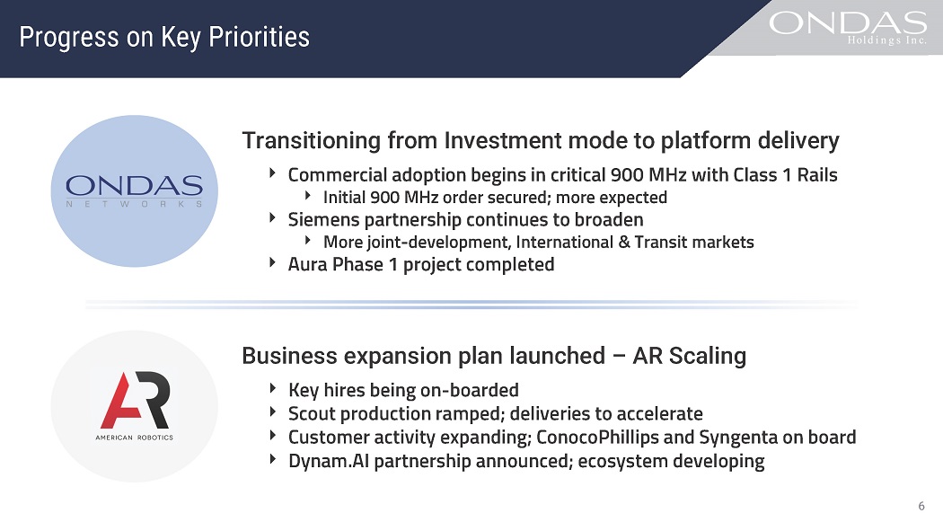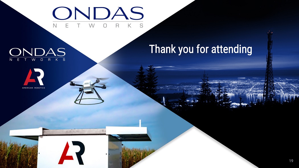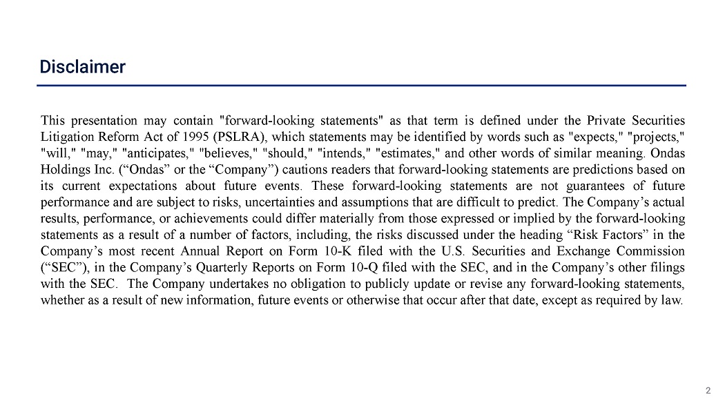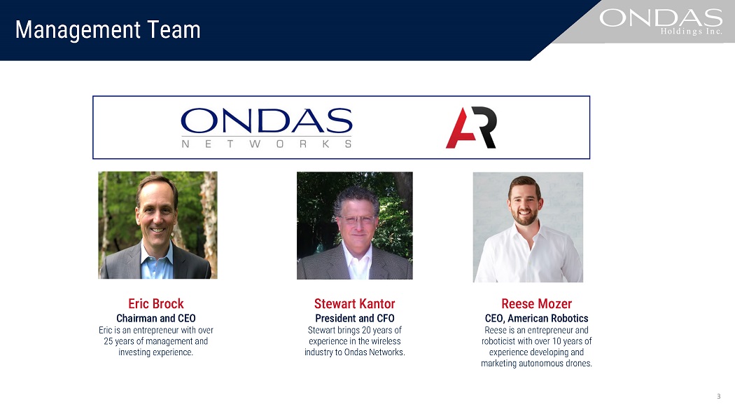 Disclaimer This presentation may contain "forward - looking statements" as that term is defined under the Private Securities Litigation Reform Act of 1995 (PSLRA), which statements may be identified by words such as "expects," "projects," "will," "may," "anticipates," "believes," "should," "intends," "estimates," and other words of similar meaning . Ondas Holdings Inc . (“Ondas” or the “Company”) cautions readers that forward - looking statements are predictions based on its current expectations about future events . These forward - looking statements are not guarantees of future performance and are subject to risks, uncertainties and assumptions that are difficult to predict . The Company’s actual results, performance, or achievements could differ materially from those expressed or implied by the forward - looking statements as a result of a number of factors, including, the risks discussed under the heading “Risk Factors” in the Company’s most recent Annual Report on Form 10 - K filed with the U . S . Securities and Exchange Commission (“SEC”), in the Company’s Quarterly Reports on Form 10 - Q filed with the SEC, and in the Company’s other filings with the SEC . The Company undertakes no obligation to publicly update or revise any forward - looking statements, whether as a result of new information, future events or otherwise that occur after that date, except as required by law . 2