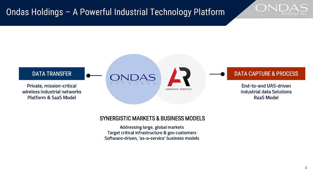 3 Management Team Reese Mozer CEO, American Robotics Reese is an entrepreneur and roboticist with over 10 years of experience developing and marketing autonomous drones. Eric Brock Chairman and CEO Eric is an entrepreneur with over 25 years of management and investing experience. Stewart Kantor President and CFO Stewart brings 20 years of experience in the wireless industry to Ondas Networks.