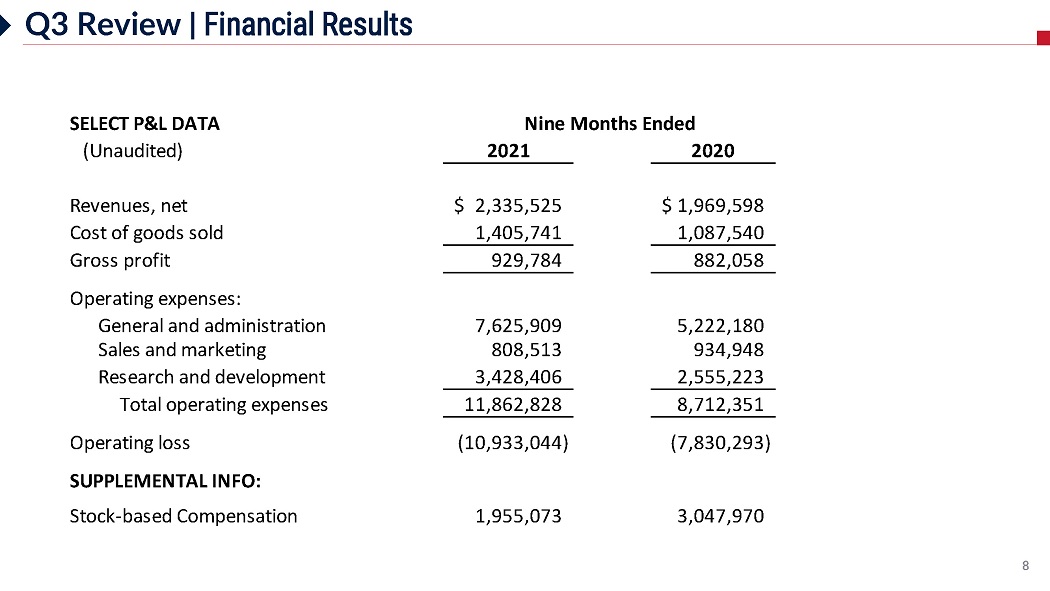 Q3 Review | Financial Results SELECT P&L DATA (Unaudited) 2021 2020 Revenues, net 2,335,525$ 1,969,598$ Cost of goods sold 1,405,741 1,087,540 Gross profit 929,784 882,058 Operating expenses: General and administration 7,625,909 5,222,180 Sales and marketing 808,513 934,948 Research and development 3,428,406 2,555,223 Total operating expenses 11,862,828 8,712,351 Operating loss (10,933,044) (7,830,293) SUPPLEMENTAL INFO: Stock-based Compensation 1,955,073 3,047,970 Nine Months Ended 8