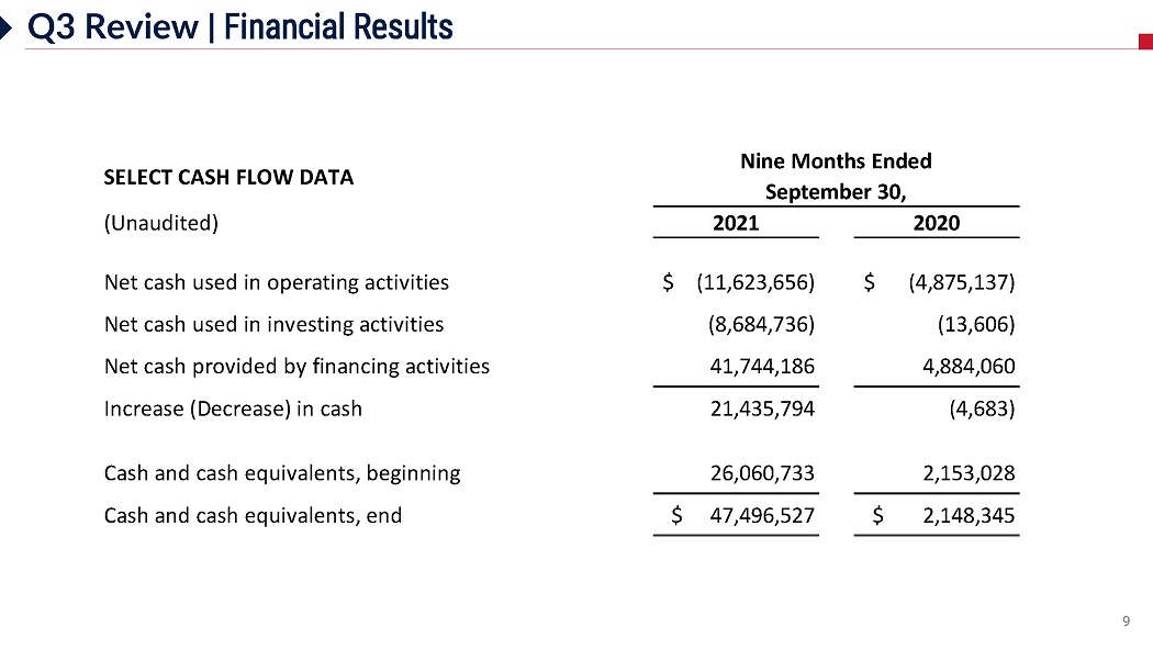 Q3 Review | Financial Results (Unaudited) 2021 2020 Net cash used in operating activities $ (11,623,656) $ (4,875,137) Net cash used in investing activities (8,684,736) (13,606) Net cash provided by financing activities 41,744,186 4,884,060 Increase (Decrease) in cash 21,435,794 (4,683) Cash and cash equivalents, beginning 26,060,733 2,153,028 Cash and cash equivalents, end $ 47,496,527 $ 2,148,345 SELECT CASH FLOW DATA Nine Months Ended September 30, 9
