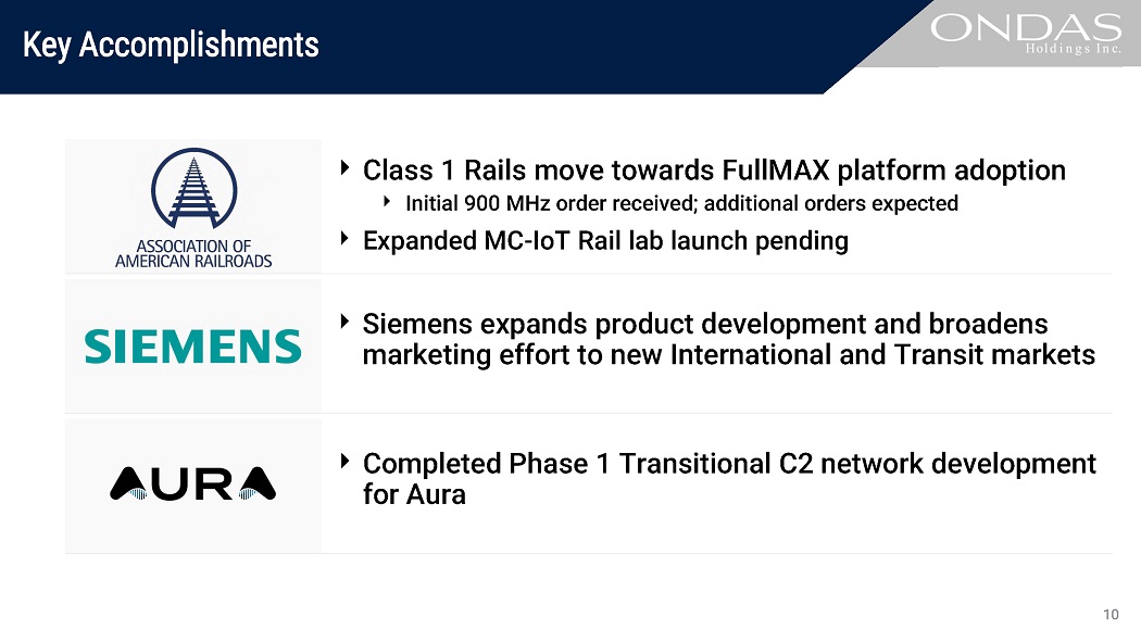 Class 1 Rails move towards FullMAX platform adoption Initial 900 MHz order received; additional orders expected Expanded MC - IoT Rail lab launch pending Key Accomplishments Siemens expands product development and broadens marketing effort to new International and Transit markets Completed Phase 1 Transitional C2 network development for Aura 10
