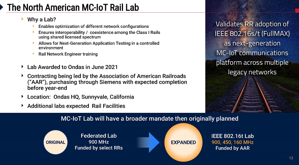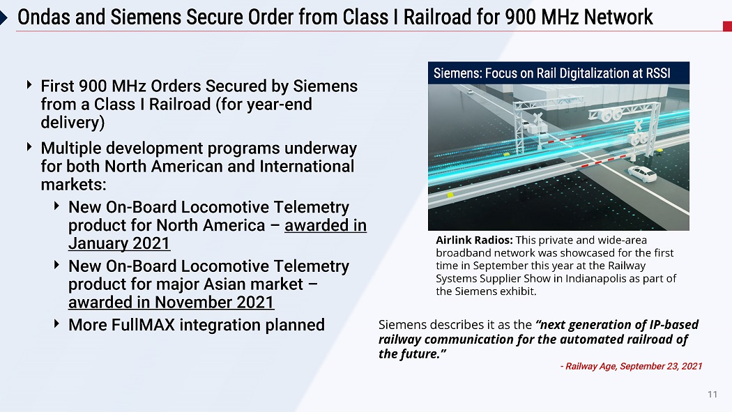 Ondas and Siemens Secure Order from Class I Railroad for 900 MHz Network First 900 MHz Orders Secured by Siemens from a Class I Railroad (for year - end delivery) Multiple development programs underway for both North American and International markets: New On - Board Locomotive Telemetry product for North America – awarded in January 2021 New On - Board Locomotive Telemetry product for major Asian market – awarded in November 2021 More FullMAX integration planned Airlink Radios: This private and wide - area broadband network was showcased for the first time in September this year at the Railway Systems Supplier Show in Indianapolis as part of the Siemens exhibit. Siemens: Focus on Rail Digitalization at RSSI - Railway Age, September 23, 2021 Siemens describes it as the “next generation of IP - based railway communication for the automated railroad of the future.” 11