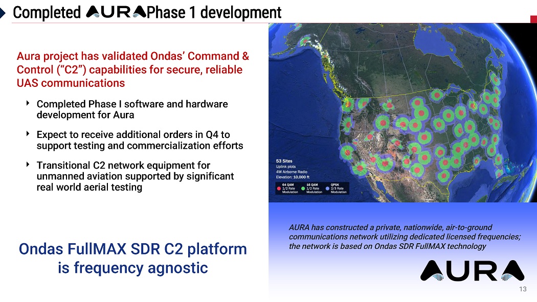 Completed Phase I software and hardware development for Aura Expect to receive additional orders in Q4 to support testing and commercialization efforts Transitional C2 network equipment for unmanned aviation supported by significant real world aerial testing AURA has constructed a private, nationwide, air - to - ground communications network utilizing dedicated licensed frequencies; the network is based on Ondas SDR FullMAX technology Completed Phase 1 development Ondas FullMAX SDR C2 platform is frequency agnostic Aura project has validated Ondas’ Command & Control (“C2”) capabilities for secure, reliable UAS communications 13