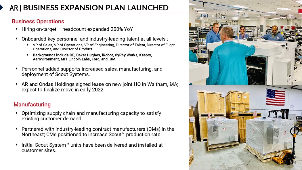 Hiring on - target – headcount expanded 200% YoY Onboarded key personnel and industry - leading talent at all levels : VP of Sales, VP of Operations, VP of Engineering, Director of Talent, Director of Flight Operations, and Director of Product. Backgrounds include GE, Baker Hughes, iRobot, CyPhy Works, Kespry , AeroVironment, MIT Lincoln Labs, Ford, and IBM. Personnel added supports increased sales, manufacturing, and deployment of Scout Systems. AR and Ondas Holdings signed lease on new joint HQ in Waltham, MA; expect to finalize move in early 2022 Business Operations Optimizing supply chain and manufacturing capacity to satisfy existing customer demand. Partnered with industry - leading contract manufacturers (CMs) in the Northeast; CMs positioned to increase Scout Ʀ production rate Initial Scout System Ʀ units have been delivered and installed at customer sites. Manufacturing AR | BUSINESS EXPANSION PLAN LAUNCHED 14