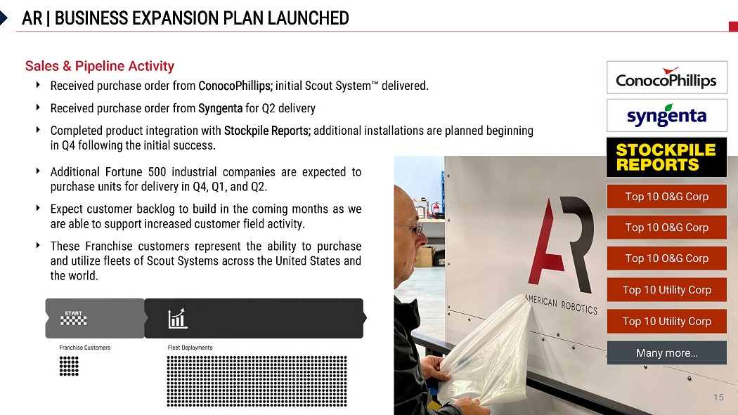AR | BUSINESS EXPANSION PLAN LAUNCHED Received purchase order from ConocoPhillips; initial Scout System Ʀ delivered. Received purchase order from Syngenta for Q2 delivery Completed product integration with Stockpile Reports; additional installations are planned beginning in Q4 following the initial success. Sales & Pipeline Activity Top 10 O&G Corp Top 10 O&G Corp Top 10 O&G Corp Top 10 Utility Corp Top 10 Utility Corp Many more… Additional Fortune 500 industrial companies are expected to purchase units for delivery in Q 4 , Q 1 , and Q 2 . Expect customer backlog to build in the coming months as we are able to support increased customer field activity . These Franchise customers represent the ability to purchase and utilize fleets of Scout Systems across the United States and the world . 15
