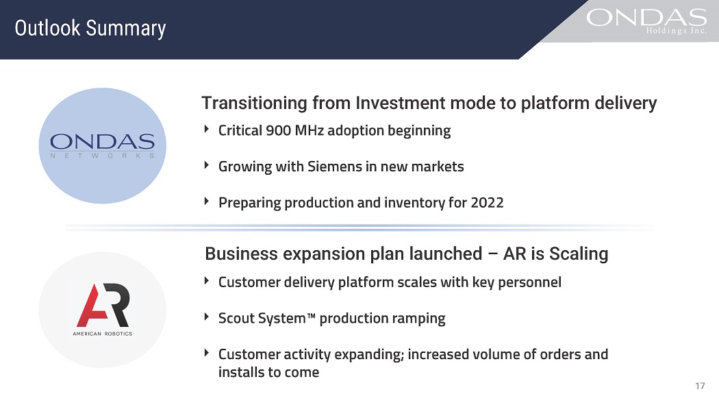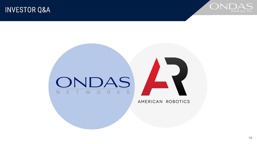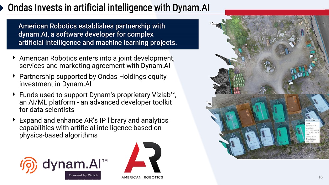 Ondas Invests in artificial intelligence with Dynam.AI American Robotics enters into a joint development, services and marketing agreement with Dynam.AI Partnership supported by Ondas Holdings equity investment in Dynam.AI Funds used to support Dynam's proprietary Vizlab Ʀ , an AI/ML platform - an advanced developer toolkit for data scientists Expand and enhance AR’s IP library and analytics capabilities with artificial intelligence based on physics - based algorithms American Robotics establishes partnership with dynam.AI, a software developer for complex artificial intelligence and machine learning projects. 16