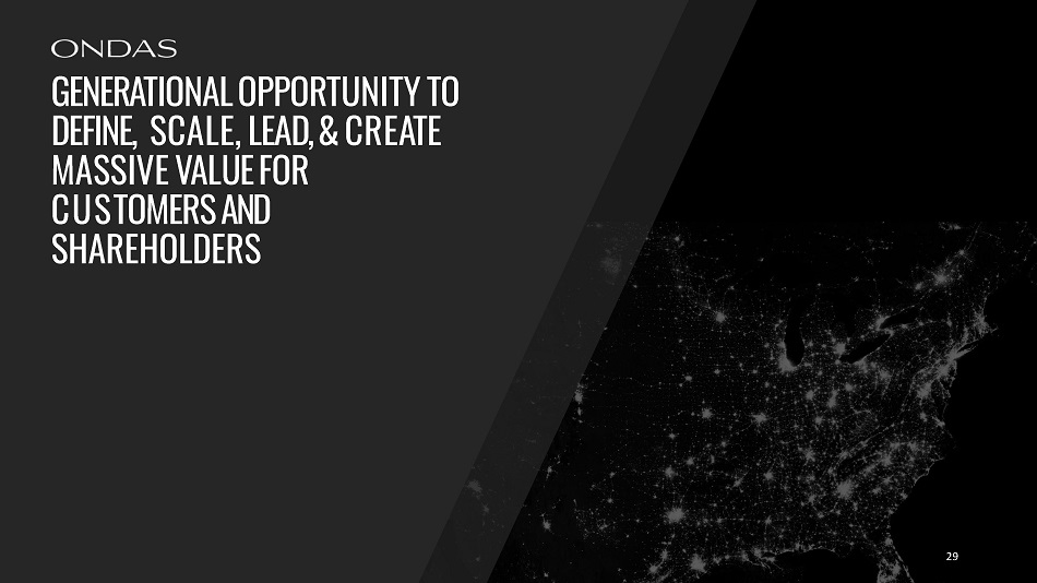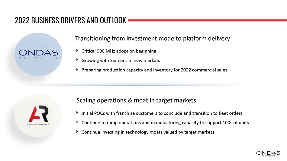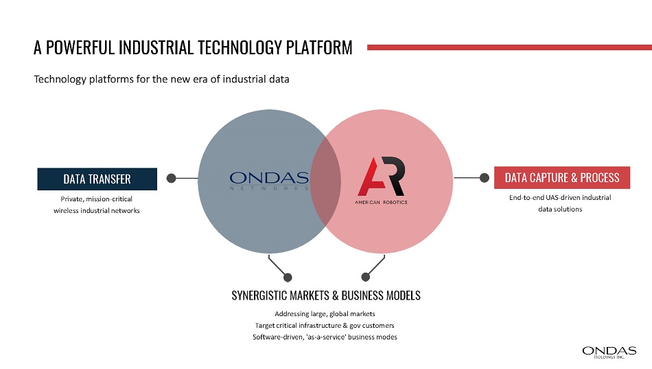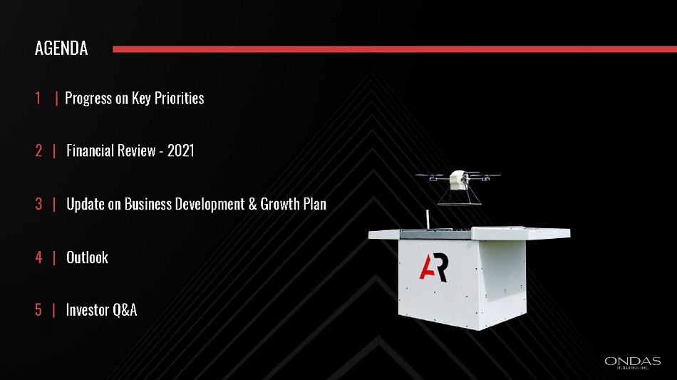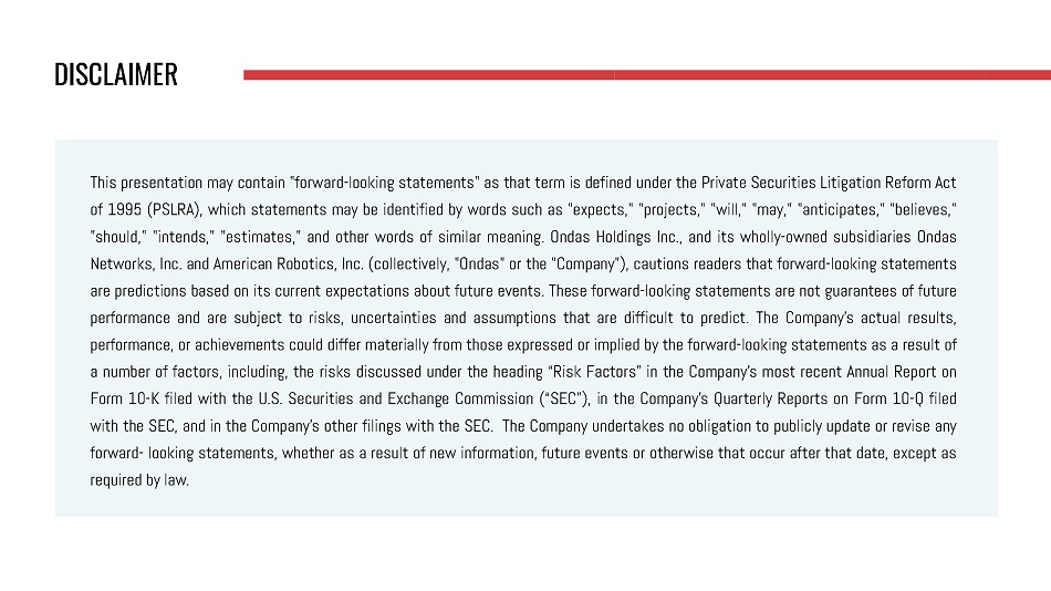 DISCLAIMER This presentation may contain "forward - looking statements" as that term is defined under the Private Securities Litigation Reform Act of 1995 (PSLRA), which statements may be identified by words such as "expects," "projects," "will," "may," "anticipates," "believes," "should," "intends," "estimates," and other words of similar meaning . Ondas Holdings Inc . , and its wholly - owned subsidiaries Ondas Networks, Inc . and American Robotics, Inc . (collectively, "Ondas" or the "Company"), cautions readers that forward - looking statements are predictions based on its current expectations about future events . These forward - looking statements are not guarantees of future performance and are subject to risks, uncertainties and assumptions that are difficult to predict . The Company’s actual results, performance, or achievements could differ materially from those expressed or implied by the forward - looking statements as a result of a number of factors, including, the risks discussed under the heading “Risk Factors” in the Company’s most recent Annual Report on Form 10 - K filed with the U . S . Securities and Exchange Commission (“SEC”), in the Company’s Quarterly Reports on Form 10 - Q filed with the SEC, and in the Company’s other filings with the SEC . The Company undertakes no obligation to publicly update or revise any forward - looking statements, whether as a result of new information, future events or otherwise that occur after that date, except as required by law .