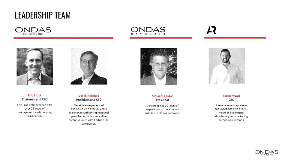 LEADERSHIP TEAM Derek Reisfield President and CFO Derek is an experienced executive with over 30 years experience with entrepreneurial growth companies, as well as executive roles with Fortune 500 companies. Eric Brock Chairman and CEO Eric is an entrepreneur with over 25 years of ma n a g e m ent a n d i n vesti n g experience. R ee se M o z e r CEO Reese is an entrepreneur and roboticist with over 10 years of experience developing and marketing autonomous drones. S t e w art K a nt or President Stewart brings 20 years of experience in the wireless industry to Ondas Networks .
