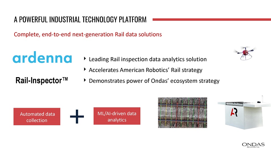 A POWERFUL INDUSTRIAL TECHNOLOGY PLATFORM Complete, end - to - end next - generation Rail data solutions Rail - Inspector Leading Rail inspection data analytics solution Accelerates American Robotics’ Rail strategy Demonstrates power of Ondas’ ecosystem strategy Automated data collection ML/AI - driven data analytics