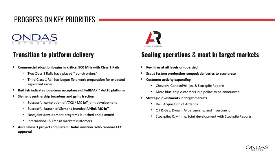 PROGRESS ON KEY PR I ORITI E S Commercial adoption begins in critical 900 MHz with Class 1 Rails Two Class 1 Rails have placed “launch orders” Third Class 1 Rail has begun field work preparation for expected significant order Rail Lab indicates long - term acceptance of FullMAX Ρ dot16 platform Siemens partnership broadens and gains traction Successful completion of ATCS / MC IoT joint development Successful launch of Siemens branded Airlink MC - IoT New joint development programs launched and planned International & Transit markets customers Aura Phase 1 project completed; Ondas aviation radio receives FCC approval Scaling operations & moat in target markets Transition to platform delivery Key hires at all levels on - boarded Scout System production ramped; deliveries to accelerate Customer activity expanding Chevron, ConocoPhillips, & Stockpile Reports More blue - chip customers in pipeline to be announced Strategic investments in target markets Rail: Acquisition of Ardenna Oil & Gas: Dynam.AI partnership and investment Stockpiles & Mining: Joint development with Stockpile Reports