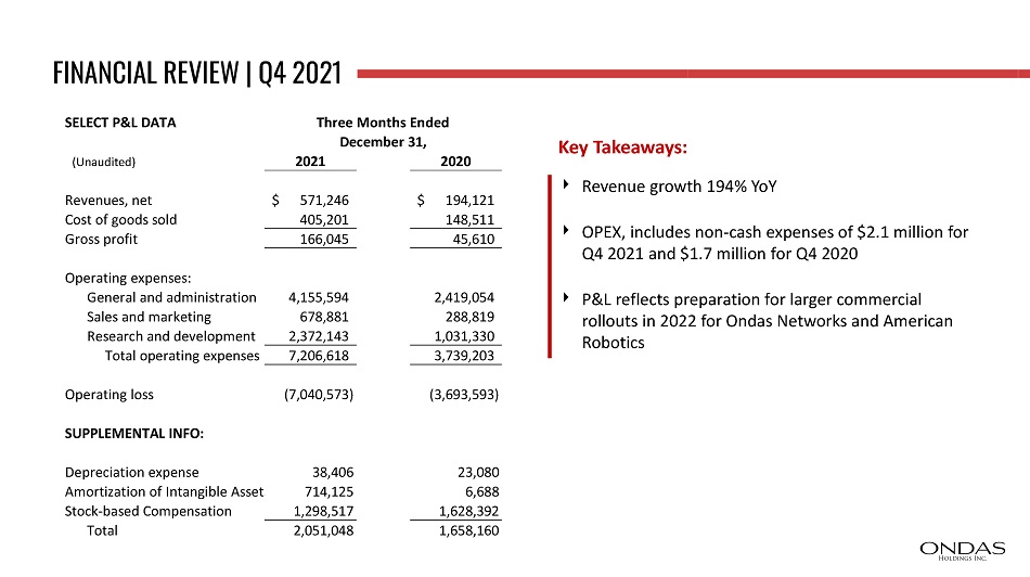 FIN A NCI A L RE V IEW | Q4 2021 SELECT P&L DATA Three Months Ended December 31, 2021 2020 (Unaudited) Revenues, net Cost of goods sold Gross profit $ 571,246 405,201 166,045 $ 194,121 148,511 45,610 Operating expenses: General and administration Sales and marketing Research and development 4,155,594 678,881 2,372,143 2,419,054 288,819 1,031,330 3,739,203 Total operating expenses 7,206,618 Operating loss SUPPLEMENTAL INFO: (7,040,573) (3,693,593) Depreciation expense 38,406 23,080 Amortization of Intangible Asset 714,125 6,688 Stock - based Compensation 1 , 298 , 51 7 1,628,392 Total 2,051,048 1,658,160 Revenue growth 194% YoY OPEX, includes non - cash expenses of $2.1 million for Q4 2021 and $1.7 million for Q4 2020 P&L reflects preparation for larger commercial rollouts in 2022 for Ondas Networks and American Robotics Key Takeaways:
