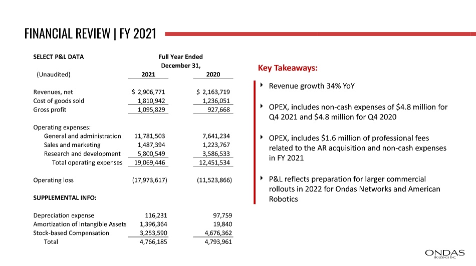 FIN A NCI A L RE V IEW | FY 2021 SELECT P&L DATA (Unaudited) 2021 2020 Full Year Ended December 31, Revenues, net Cost of goods sold Gross profit $ 2,906,771 1,810,942 1,095,829 $ 2,163,719 1,236,051 927,668 Operating expenses: General and administration Sales and marketing Research and development Total operating expenses 11,781,503 1,487,394 5,800,549 19,069,446 7,641,234 1,223,767 3,586,533 12,451,534 Operating loss (17,973,617) (11,523,866) SUPPLEMENTAL INFO: Depreciation expense Amortization of Intangible Assets Stock - based Compensation Total 116,231 1,396,364 3 , 253 , 59 0 4 , 766 , 18 5 97,759 19,840 4 , 676 , 36 2 4 , 793 , 96 1 Revenue growth 34% YoY OPEX, includes non - cash expenses of $4.8 million for Q4 2021 and $4.8 million for Q4 2020 OPEX, includes $1.6 million of professional fees related to the AR acquisition and non - cash expenses in FY 2021 P&L reflects preparation for larger commercial rollouts in 2022 for Ondas Networks and American Robotics Key Takeaways: