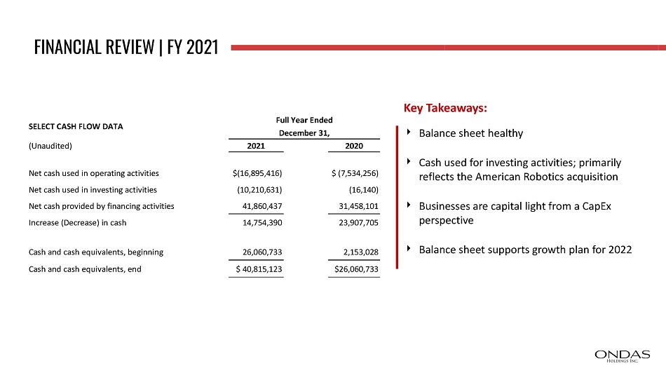 FIN A NCI A L RE V IEW | FY 2021 (Unaudited) Full Year Ended December 31, 2021 2020 Net cash used in operating activities $(16,895,416) $ (7,534,256) Net cash used in investing activities Net cash provided by financing activities (10,210,631) 41,860,437 (16,140) 31,458,101 Increase (Decrease) in cash 14 , 754 , 39 0 23 , 907 , 70 5 Cash and cash equivalents, beginning 26 , 060 , 73 3 2 , 153 , 02 8 Cash and cash equivalents, end $ 40,815,123 $26,060,733 SELECT CASH FLOW DATA Balance sheet healthy Cash used for investing activities; primarily reflects the American Robotics acquisition Businesses are capital light from a CapEx perspective Balance sheet supports growth plan for 2022 Key Takeaways: