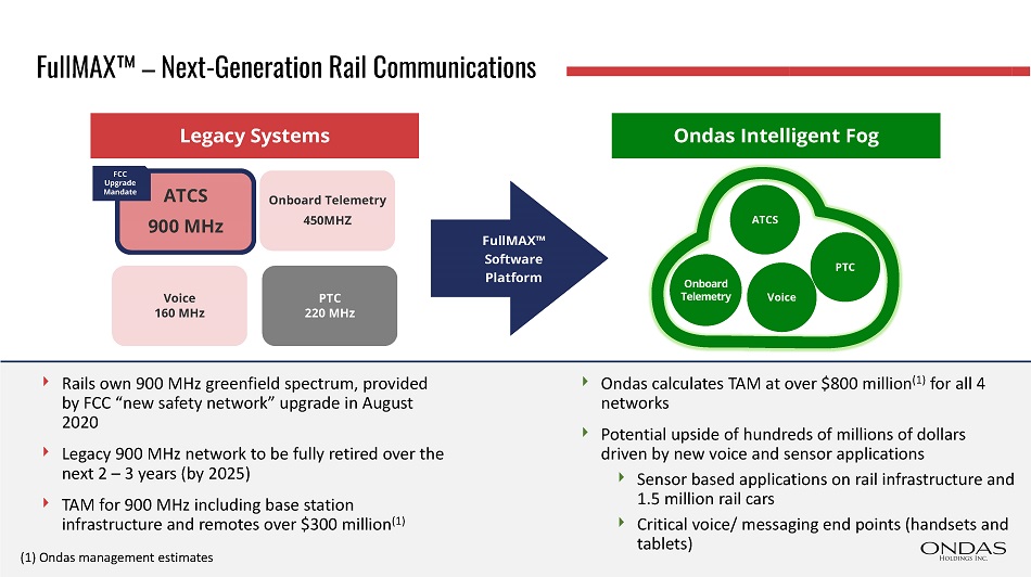 FullMAX – Next - Generation Rail Communications Onboard Te le met r y A TCS Voice PTC FullMA X Ƞ Software Platform Onboard Telemetry 450MHZ ATCS 900 MHz Voice 160 M Hz PTC 220 M Hz Legacy Systems Ondas Intelligent Fog FCC Upgrade Ma n d a te Rails own 900 MHz greenfield spectrum, provided by FCC “new safety network” upgrade in August 2020 Legacy 900 MHz network to be fully retired over the next 2 – 3 years (by 2025) TAM for 900 MHz including base station infrastructure and remotes over $300 million (1) Ondas calculates TAM at over $800 million (1) for all 4 networks Potential upside of hundreds of millions of dollars driven by new voice and sensor applications Sensor based applications on rail infrastructure and 1.5 million rail cars Critical voice/ messaging end points (handsets and tablets) (1) Ondas management estimates