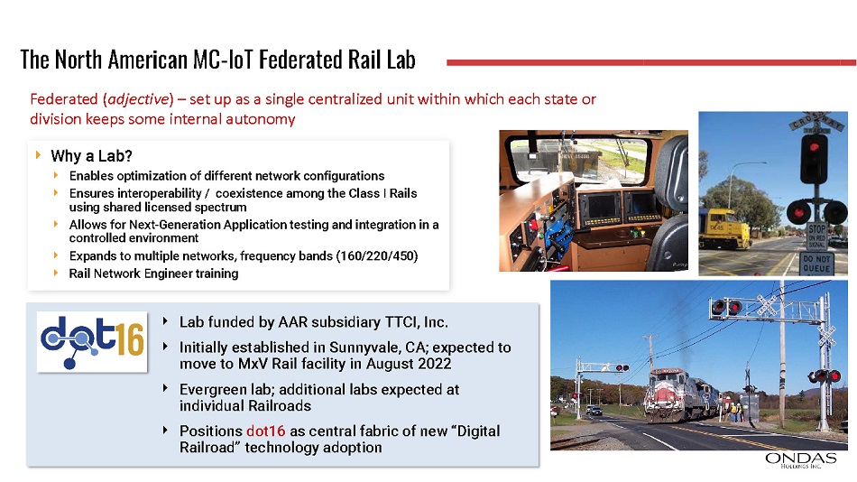 The North American MC - IoT Federated Rail Lab Federated ( adjective ) – set up as a single centralized unit within which each state or division keeps some internal autonomy Why a Lab? Enables optimization of different network configurations Ensures interoperability / coexistence among the Class I Rails using shared licensed spectrum Allows for Next - Generation Application testing and integration in a controlled environment Expands to multiple networks, frequency bands (160/220/450) Rail Network Engineer training Lab funded by AAR subsidiary TTCI, Inc. Initially established in Sunnyvale, CA; expected to move to MxV Rail facility in August 2022 Evergreen lab; additional labs expected at individual Railroads Positions dot16 as central fabric of new “Digital Railroad” technology adoption