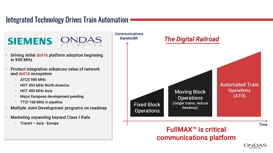 Integrated Technology Drives Train Automation FullMAX is critical communications platform Driving initial dot16 platform adoption beginning in 900 MHz Product integration enhances value of network and dot16 ecosystem ATCS 900 MHz HO T 45 0 M H z North Ame rica HO T 45 0 M H z Asia M a j o r E urope an dev e l o pm e n t pendi ng TTCI 160 MHz in pipeline Multiple Joint - Development programs on roadmap Marketing expanding beyond Class I Rails Transit – Asia - Europe The Digital Railroad Fixe d Bloc k Operations Movin g Bloc k Operations (longer trains, reduce headway) Automated Train Operat i ons (ATO) Tim e C o m m unic a ti o ns Bandwidth
